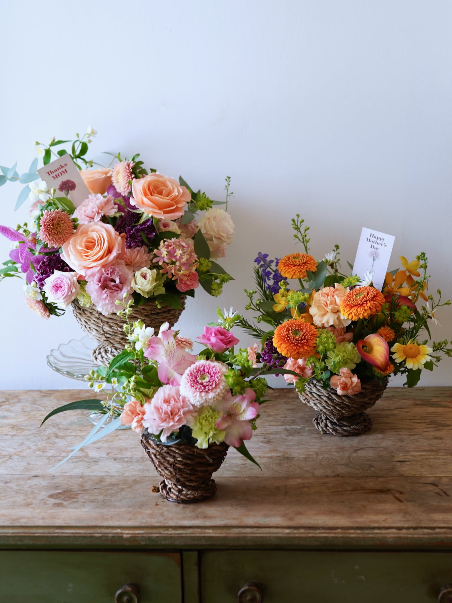 足つきのおしゃれなバスケットを使って、カーネーションやバラ、季節のグリーンでナチュラルに仕上げた母の日限定のフラワーアレンジメントです。