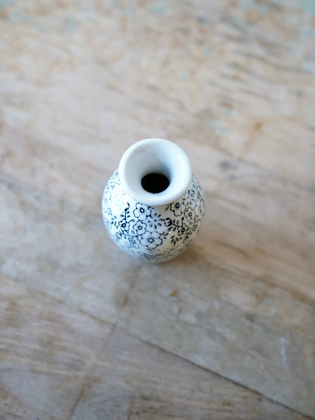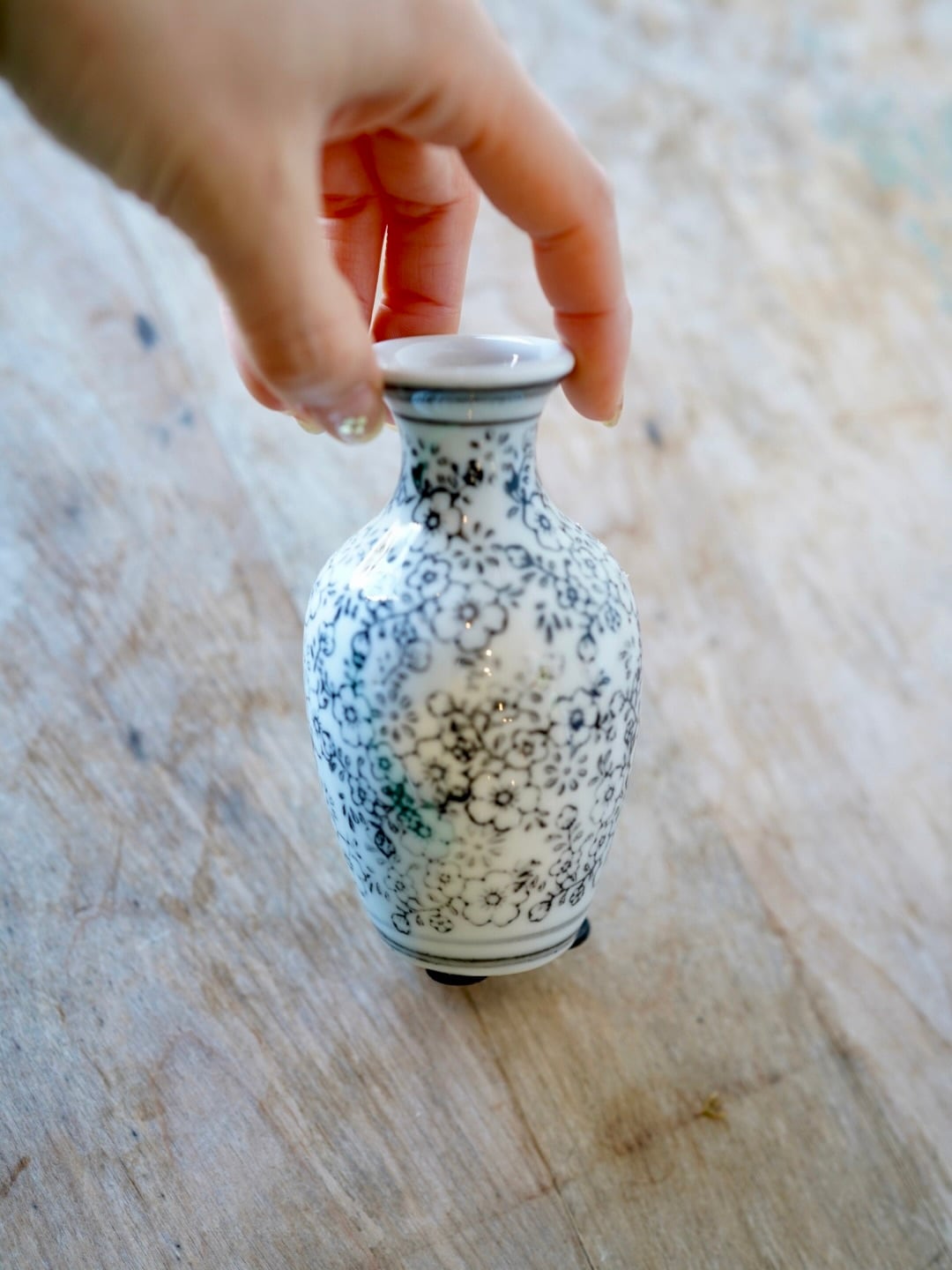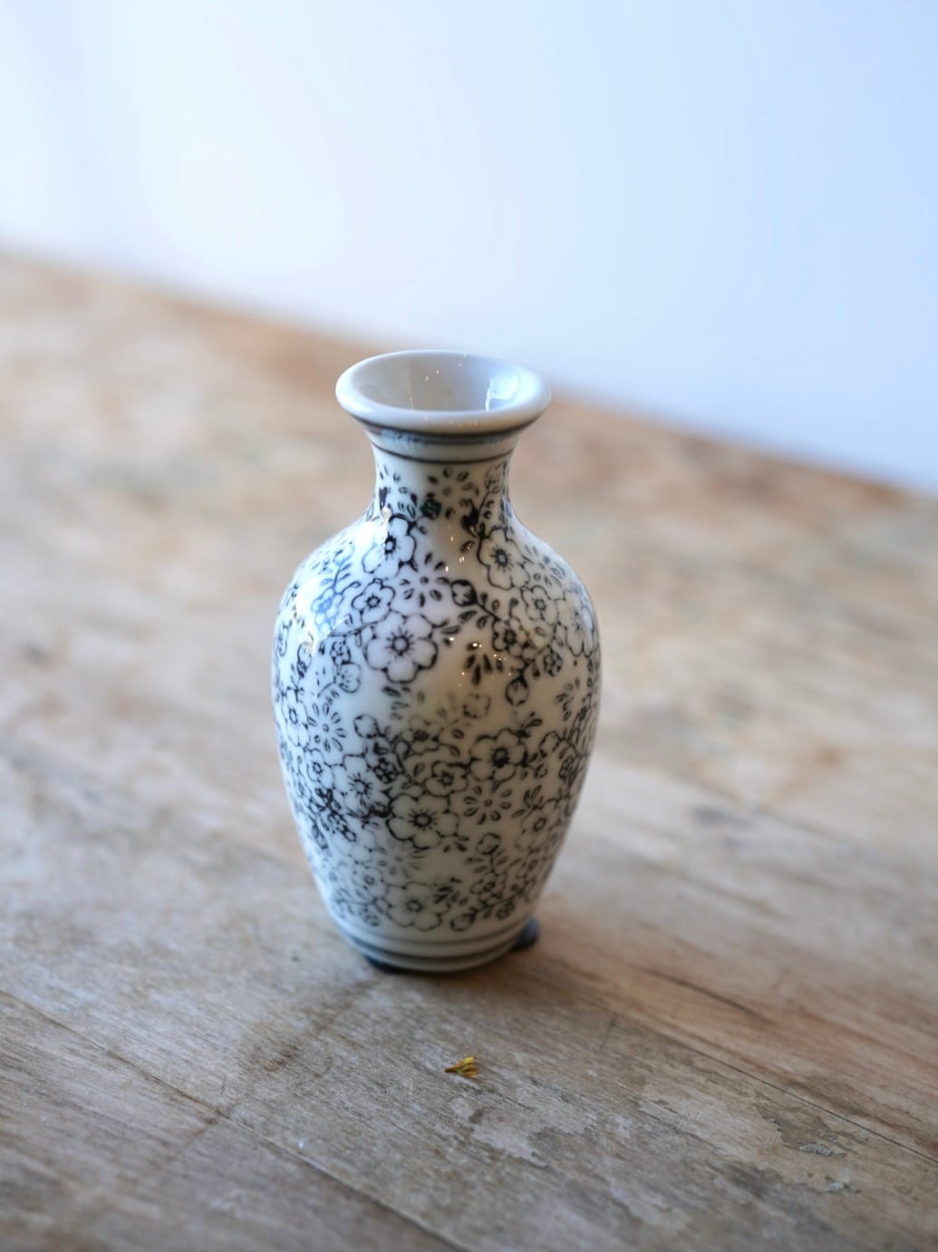 白い地に掠れた小花柄を施した徳利型のフラワーベースです。