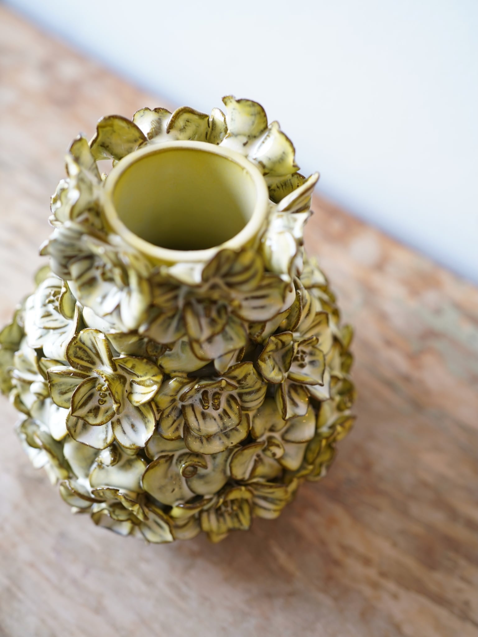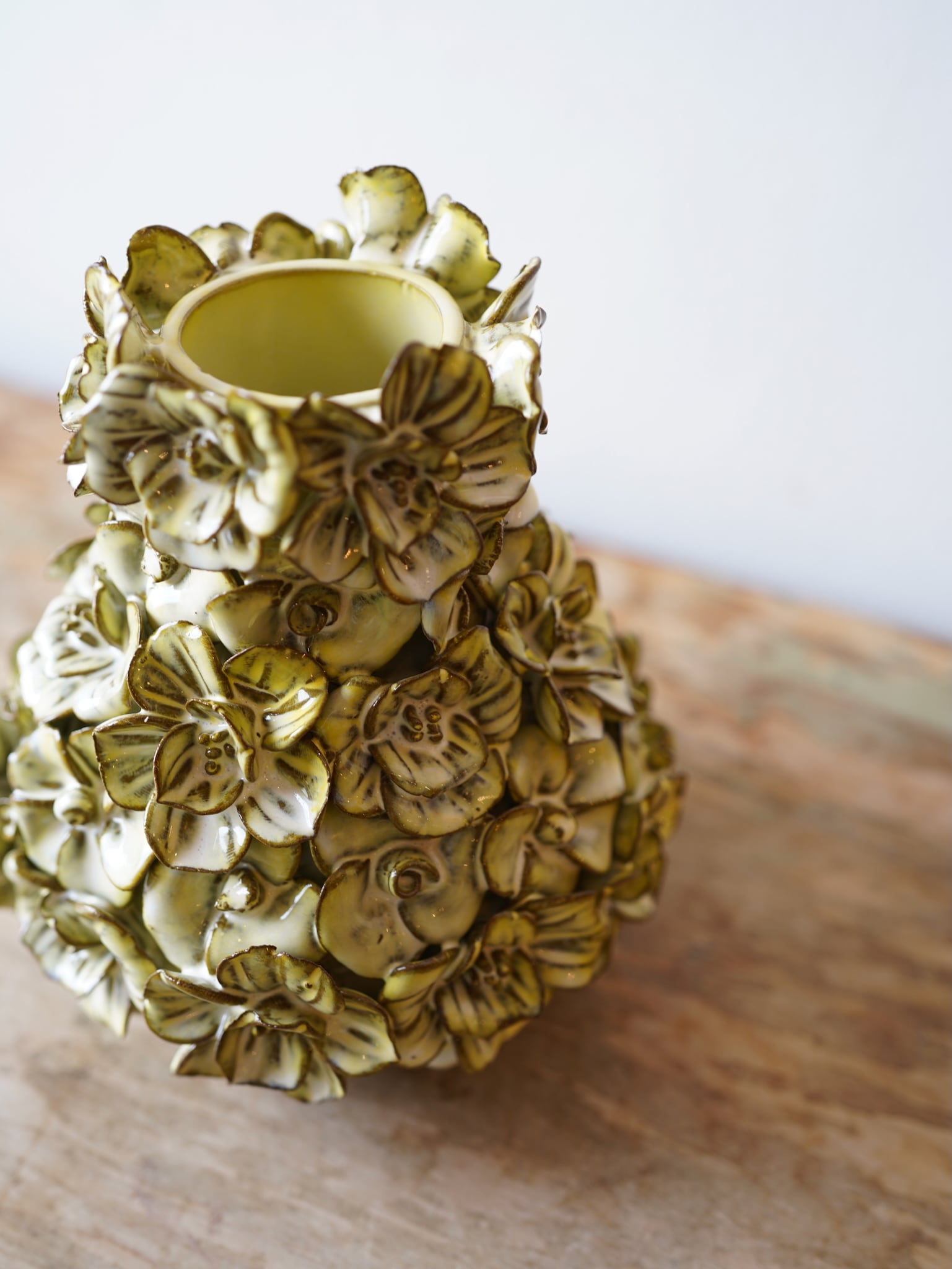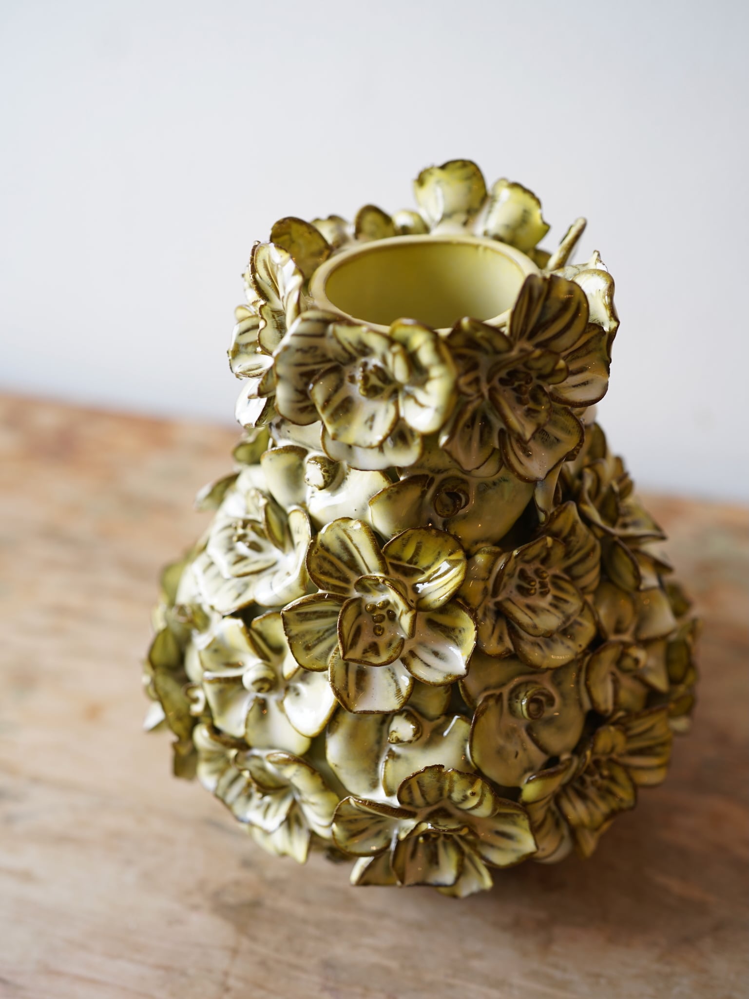 ぐるっと一周、薄からし色の花がちりばめられたフラワーベース。
